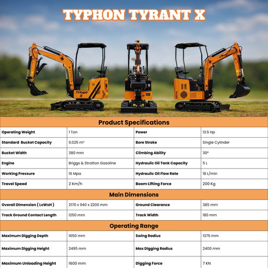 TYPHON TYRANT X 1-Ton Mini Excavator 13.5HP Briggs & Stratton Engine, Hydraulic Thumb Clip, Dozer Blade, 360° Body Swing
