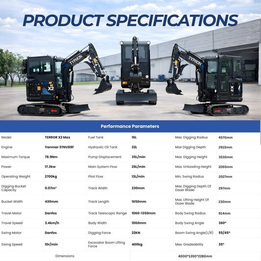 TYPHON TERROR X2 Max 2.7-Ton Mini Excavator Yanmar 3TNV88F Diesel Engine, Retractable Track, Pilot Controls, AC/Heater Cabin